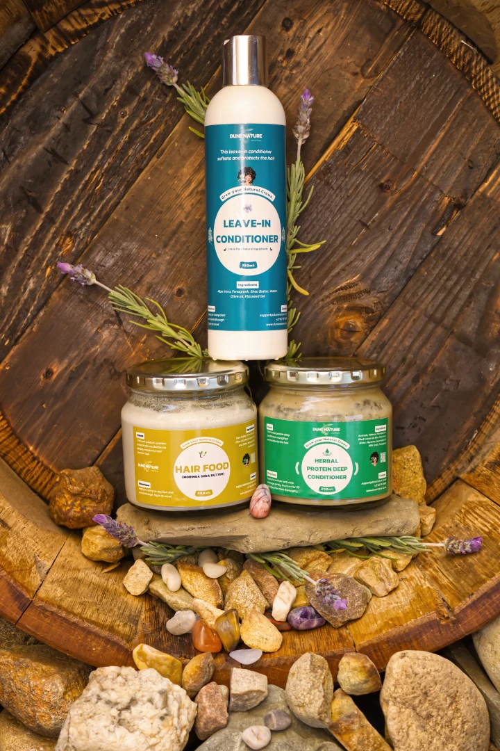 For stronger, healthier, and more nourished hair, the Thick Hair Combo is designed to moisturize, soften, and strengthen thick hair while preventing breakage. This powerhouse trio—Hair Food, Leave-In Conditioner, and Herbal Protein Deep Conditioner—works together to boost hydration, restore elasticity, and promote hair growth.
